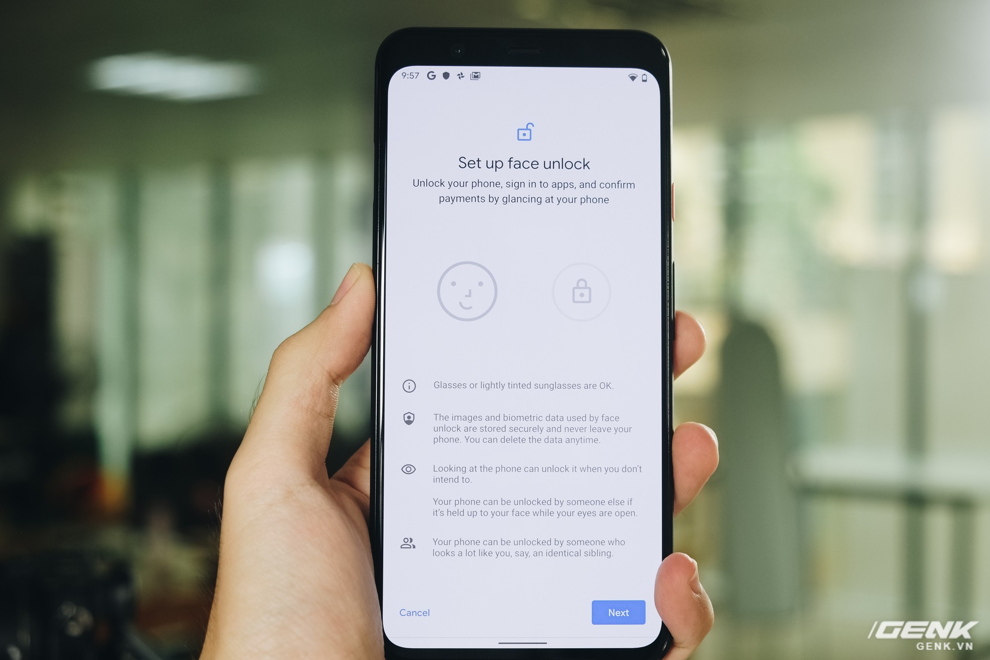 Ansiktsupplåsningen fungerar med glasögon och rentav solglasögon, om de inte är för mörkt tonade. All biometrisk data lagras lokalt och säkert och lämnar aldrig telefonen. Uppgifterna kan även raderas. Google påpekar att enheten kan råka låsas upp fastän det inte var användarens avsikt, samt att en identisk tvilling kan ta sig in.