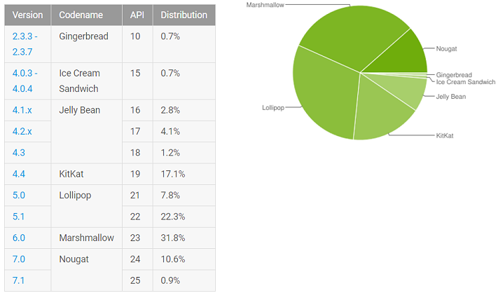 Enligt Googles senaste statistik körs till sist version 7.0 – 7.1 Nougat på över tio procent av världens aktiva Androidenheter. På en månad har Nougat klättrat två procentenheter upp till 11,5 procent.