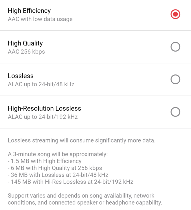 Den förlustfria och okomprimerade musikuppspelningen aktiveras från ljudkvalitets-kategorin bland inställningarna. Appen erbjuder två förlustfria alternativ, varav det första är upp till 24-bit/48 kHz.