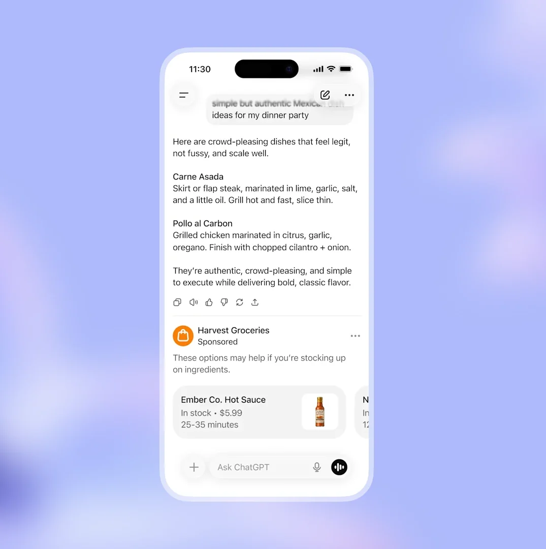 I början visas annonserna längst ned under svaren när det finns ”en relevant sponsrad produkt eller tjänst” baserat på användarens aktuella konversation. Enligt Open AI kommer reklamen att vara tydligt markerad och separerad från svaren.
