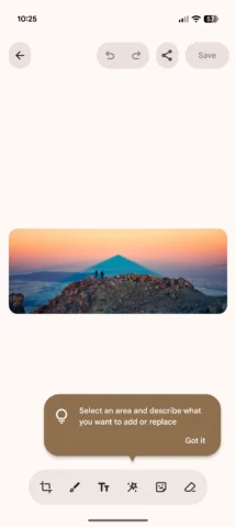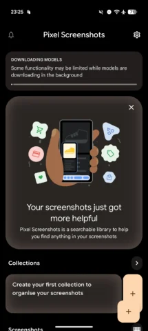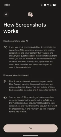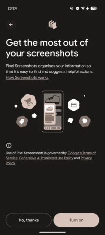 Första gången appen startades laddade den hem en modell som körs lokalt och offline av Gemini Nano: inget bearbetas i molnet. Efter att Screenshots installerats visas ett nytt gränssnitt varje gång du tar en skärmbild. Gamla gränssnittet kan fortfarande nås genom att trycka på pennan högst upp.