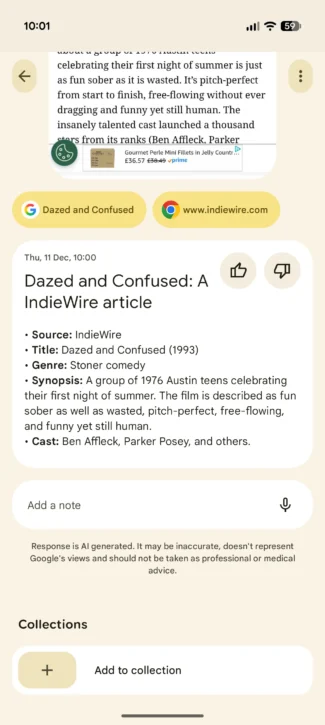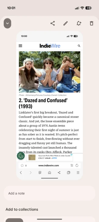 I exemplet ovan sparades som test en film från en topplista med Richard Linklaters bästa filmer. Screenshots la till källa (Indie Wire), namn och årtal för filmen, samt regissör, genre, synopsis och rollbesättning.