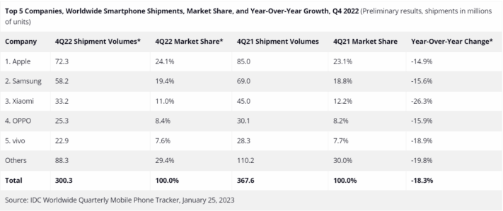 Återförsäljare ska därför haft problem att tömma sina lager, så de har beställt färre enheter av tillverkarna. IDC listar samtidigt de fem största smartphonetillverkarna under fjärde kvartalet 2022 samt under hela 2022.