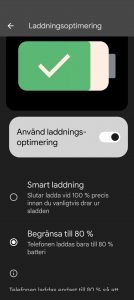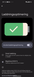 Fick laddningsoptimering med nu i morse. Bara för er info, så kommer telefonen ibland ändå ladda till 100% även om begränsningen satts till 80%. Detta för att kalibrera mätningen av batteriet.