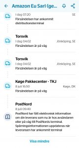Om du går in under Order på Amazon DE och tryck på "Track Package" och sedan "See all updates" så ser man hur paketet gått innan det kommit till PostNord