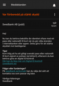 Ja, jag hade varken pass eller nationellt id. Passet gått ut. Klarat mig på bara körkortet men jag skaffade nationellt id när de körde det för 100 kr, det var ju bra nu i efterhand men jag bär bara med mig körkortet. Fick detta från banken i slutet av januari: