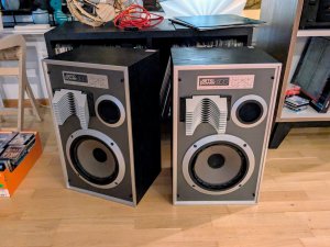 Retrohögtalare, Minidisc:ar och kassettband i en och samma bild.