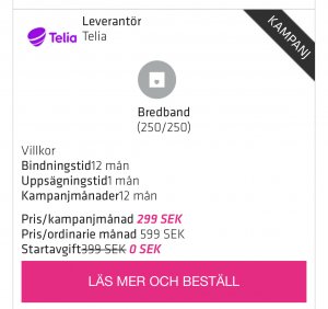 Telia har inte ändrat än på sin sida. Men söker jag bland operatörer i mitt stadsnät itux, får jag fram ny kampanj för bredband.