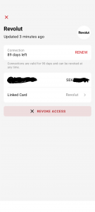 Kopplingen sker via Revolut appen och en tredjeparts leverantör (Truelayer Ireland) och ser ut så här i Curve appen: