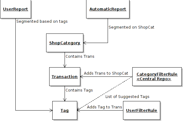 Alla transaktioner går automatiskt in i olika kategorier, om användaren vill påverka detta så ställer han in lokala filter som åsidosätter/kompletterar de globala. Han kan också manuellt gå in på en specifik transaktion och märka upp den. Korrekt?