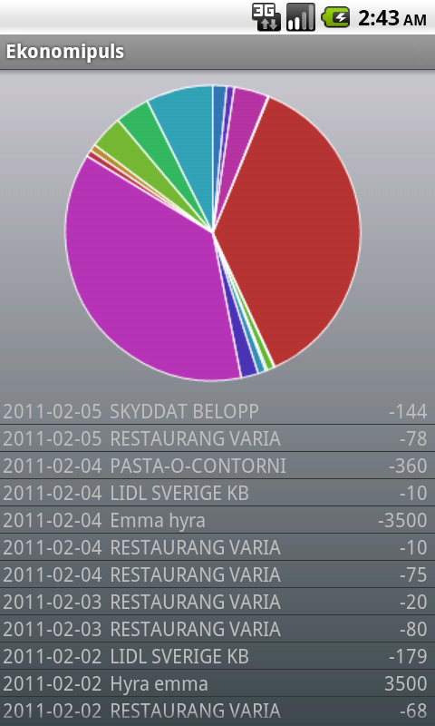 Här är en snapshot på hur det ser ut nu. Alla transaktioner får en egen "slice" vilket inte riktigt är tanken senare. Har inte lagt till i datamodellen att kunna tagga upp transaktioner ännu. Men det blir nästa steg. Då kommer det att vara olika kategorier.