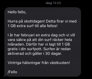 Fello kör dubbelsurf på det minsta abonnemanget igen så 3 GB blir 6 GB.