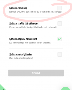 Jag skrev till supporten för att dubbelkolla. Först bekräftade man vad du skrev här att den spärren endast gäller för roaming utanför EU/EES (även fast det står inkl. EU/EES). Sen hade personen pratat med ansvariga som hade tagit upp det på något möte nyligen, då ändrade man sig och sa att den spärren gäller all roaming (även inom EU/EES). Nästan mer förvirrad nu än jag var innan jag kontaktade supporten.