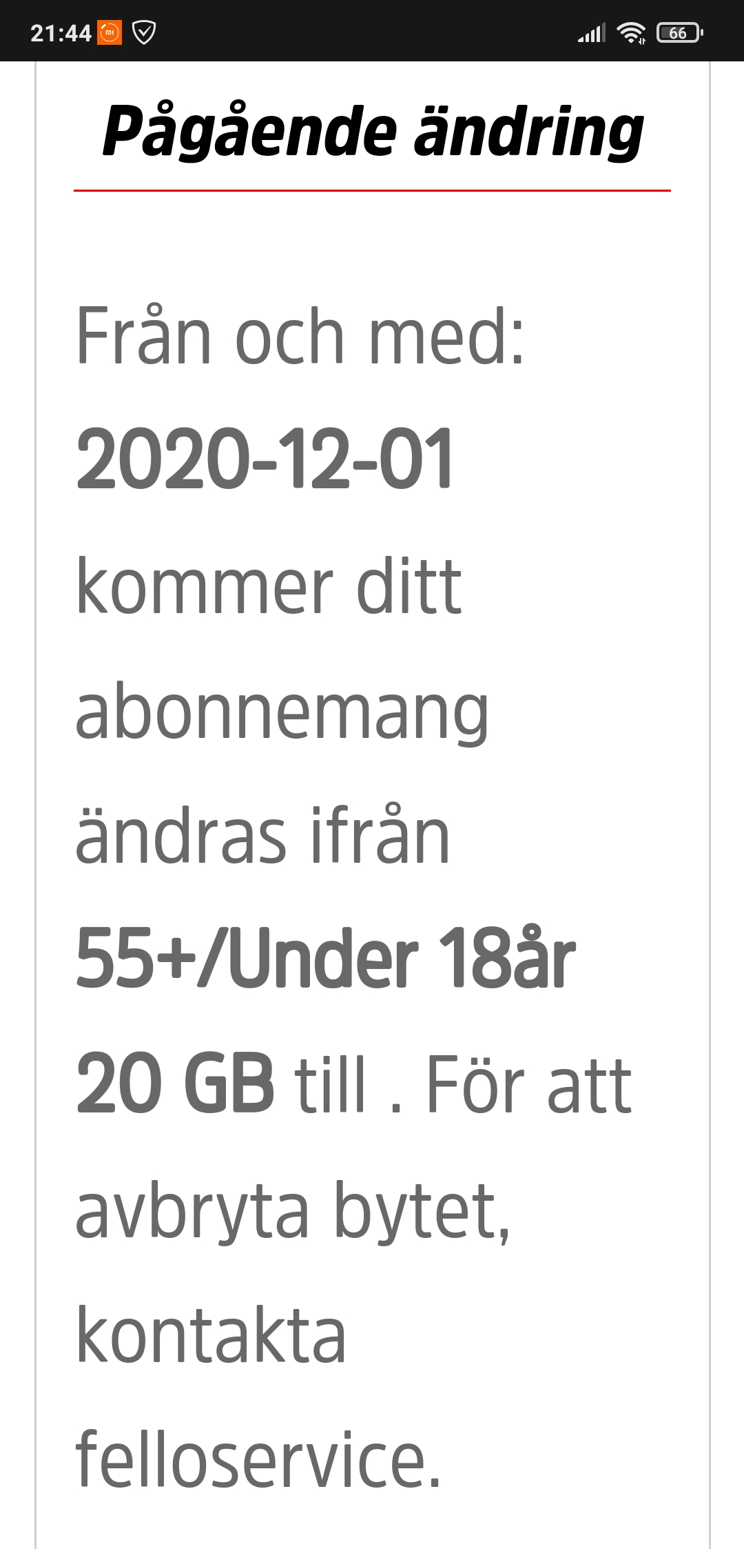 Jag hörde av mig till kundtjänst och ändrade till senior 3 x 32 = 96 GB fick ett sms ganska omgående och det finns även ett besked om ändringen på mina sidor . Tycker att Fello har en betydligt bättre kundtjänst än den operatatör som jag hade tidigare är synnerligen nöjd att jag har bytt till Fello