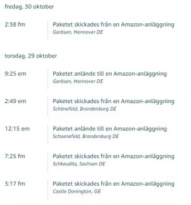 Min första amazon.se-beställning gick från Tyskland till Toftanäs och ska levereras redan imorgon. Angiven leveransdag var måndag 4/11. Intressant även att paketet hoppade över Køge i Danmark.
