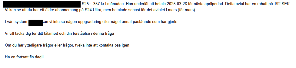 Min var/är fortfarande fast på frakt begärd, så ringde deras kundtjänst här nu direkt på morgonen. Alla förköp ska vara utskickade enligt kvinnan jag hamnade hos, men inte min? Fick därefter sitta i 20 minuter med en fruktansvärd väntemusik - trodde telefonens hörlur skulle gå sönder efter ett tag. Sen kommer kvinnan tillbaka och påstår att den adress som jag bott på sedan fem år tillbaka inte finns, så beställningen ska annulleras då man inte kan byta adress vid köp med Klarna (även om jag betalade med Swish genom Klarna). Men detta är alltså typ den tionde enheten jag köpt från Samsung.se och alla har levererats hit utan problem - var visserligen lite jobbigt i början när huset var nybyggt, men det var buden som hade svårt att hitta hit utan GPS, men det är snart fem år sedan.. Hon kunde inte svara på hur alla mina andra enheter, till exempel så sent som för fyra månader sedan, levererats hit till exakt samma adress - eller till utlämningsstället/paketboxen. Tackade ja till att makulera beställningen och istället köpa den med kontokort direkt då (återbetalningen kom i alla fall direkt in på Klarna-kontot) och så kunde Samsung korrigera adressen så den passar i Postnords fraktbeställning. Men min värdecheck på 15% då? Nej den kan Samsung inte fixa - den är förbrukad. Ge mig en ny då? "Nej, det är inte vi som gjort något fel, det är du som kund som skrivit i fel adress". Jag slängde på luren efter ett par väl valda ord.