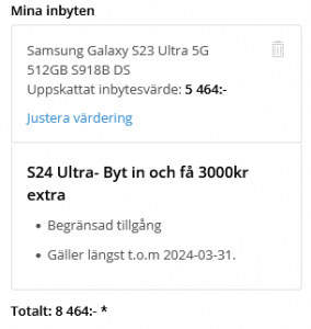 Jag får ner priset i Samsung Shop till 14 431 kr för 512GB utan inbyte. Sugen på att slå till men vet inte om jag hellre väntar på Xiaomi 14 Pro. Frågan är hur tillgänglig den kommer vara och vad den kommer kosta.