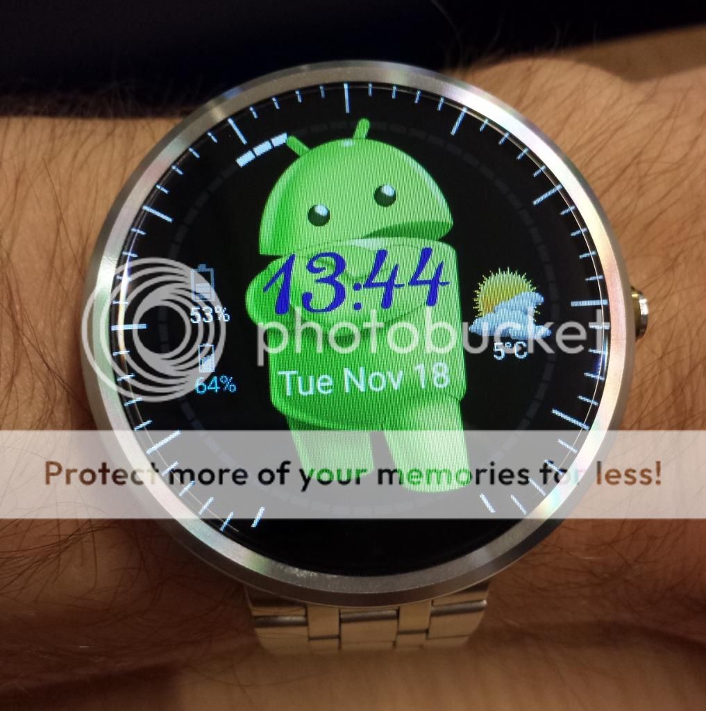 Förbättrade min Watchface (fortfarande i Watchmaker Premium). Tog bort visarna, och fixade så att sekunderna istället tickar runt en grå cirkel (som syns lite dåligt på bilden, men syns mer i verkligheten - sekunderna ligger runt 55 här). Har klockans batteri överst (syns även vid notifikationer) och telefonens batteri under, väder och temperatur till höger, och förstås tid och datum i mitten. Vad tycks? http://i214.photobucket.com/albums/cc34/_Merlin_80/Moto360-AndroidWatchface.jpg Har för övrigt avsiktligt gjort så att Androiden kliver fram lite på cirkeln längst ner till höger (och antennerna sticker ut framför upptill) för att skapa lite mer djup.
