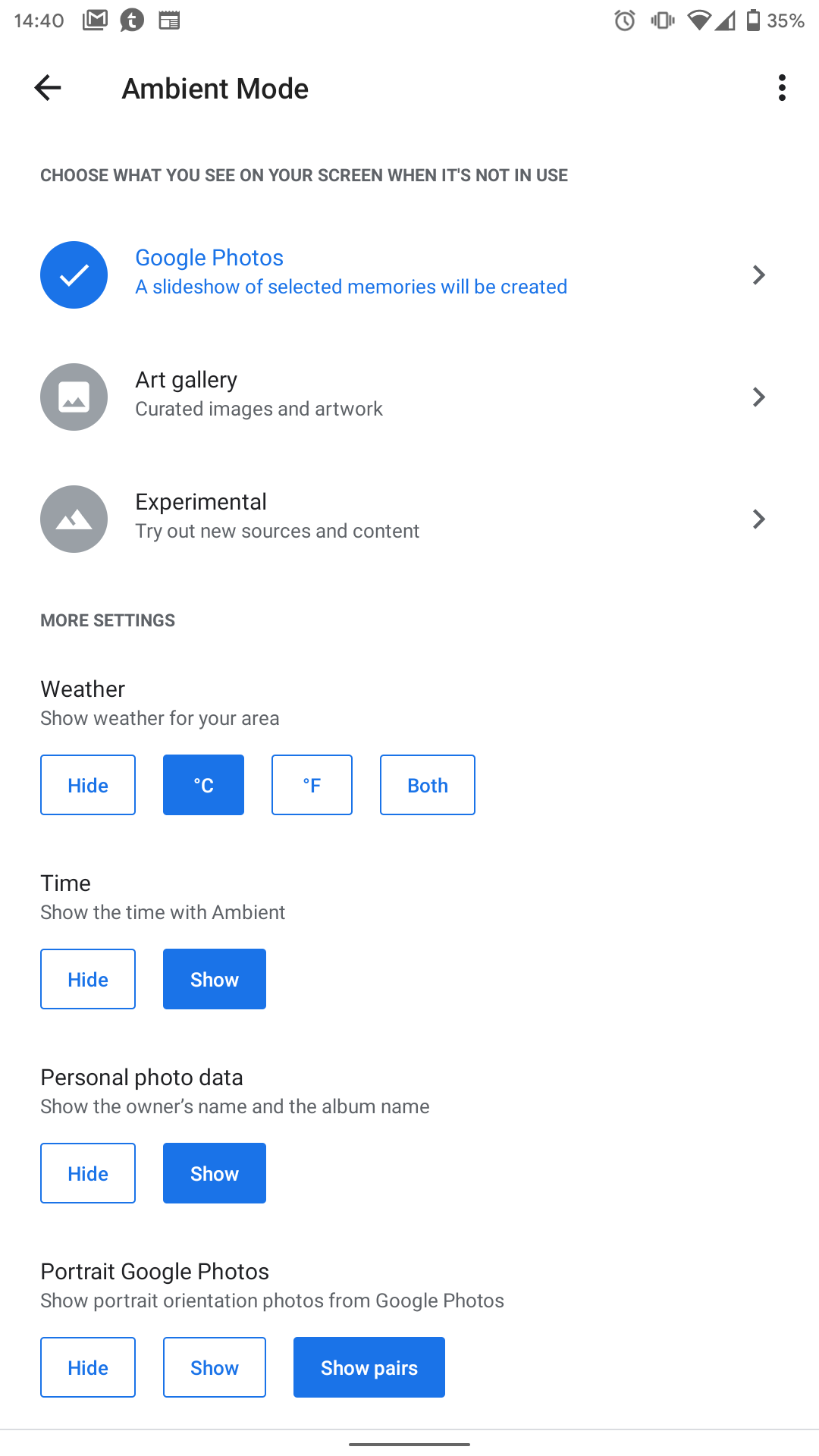 Såhär ser det alltså ut med Google Photos, Ena stunden är inställningen där, andra inte. Nån mer som fått upp Google Photos under ambient mode? Och består det eller flippar det likt hemma hos mig?