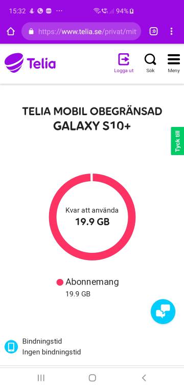Byte jag med idag hade samma med 20GB surf som du, ringde Telia och dom sa att det kommer ändra sig under natten i natt, så i morgon kommer det stå obegränsat.