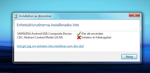 Upptäckte att jag inte körde ordinare start utan LauncherPro. Slog över till Start med Usb sladden i och då började genast drivrutiner installeras... ett tag varpå följande resultat, som jag tror jag fått innan... erhölls. Kan detta ha med mitt problem att få telefonen att fungera med Kies att göra? Tips eller föslag om hur jag löser detta? [​IMG]