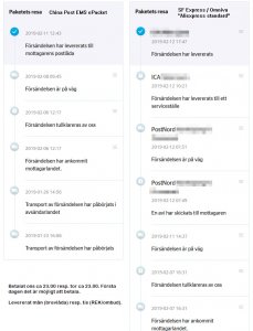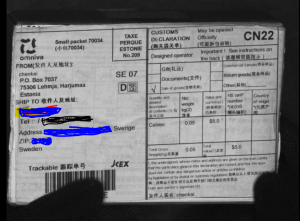 Estland etiketten var klistrad över ursprungsetiketten(postnord kunde följa paketet hela vägen bakåt)