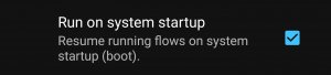Tips, du behöver inte starta om en Flow efter omstart av telefonen. Under inställningar finns möjligheten att autostarta Flows.