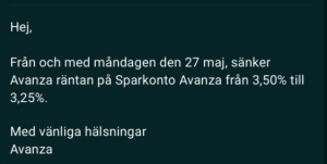 Avanza sänker räntan från den 27 maj från 3,50% till 3,25%.