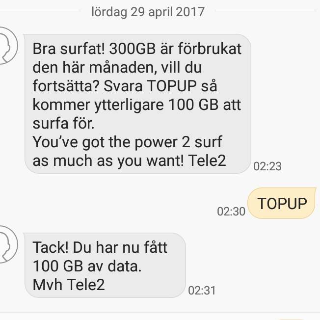 Skulle vilja ha ytterligare bekräftelse på deras "Unlimited", att det verkligen är 300GB, och sedan 100GB per påfyllning. Grävde fram en tråd på Tele2s Facebook-sida där detta diskuteras (med referens till inlägget i denna tråd) och dementeras. Att det fortfarande är 5GB med 1GB per sms som gäller. De har inte ens någon aning vad dessa 300GB/100GB skulle komma från.