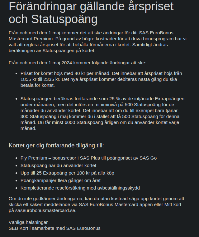 Prishöjning och förändring gällande SAS Eurobonus Mastercard-korten på g.