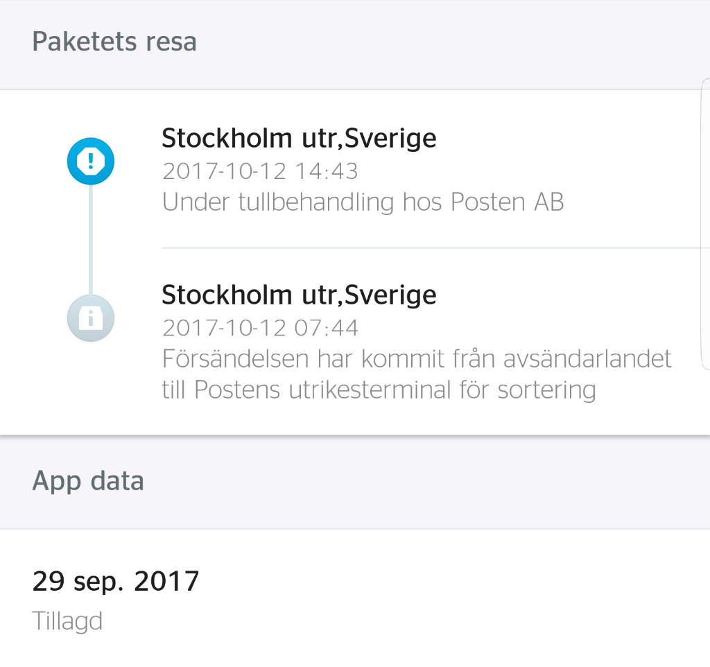 Det var precis det jag inte fick. Det finns inga skanningar inom Sverige till mitt postombud. Det finns bara skanningar från postombudet när paketet gick i automatisk retur.