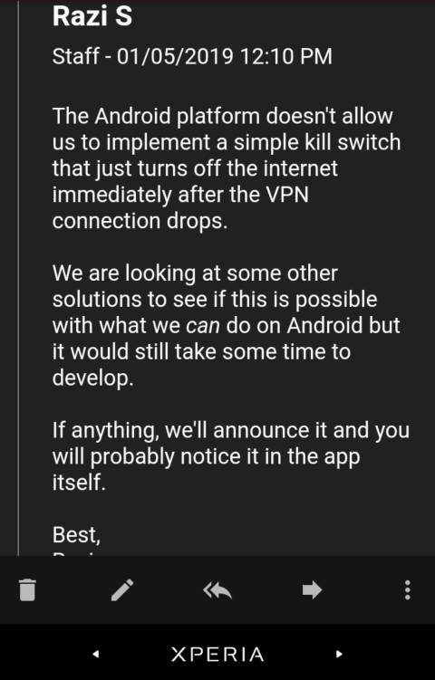 I min Huawei finns inte alternativet som det gör i tex mina Sony, att stänga av internet när VPN går ned, så jag är beroende av det i appen.
