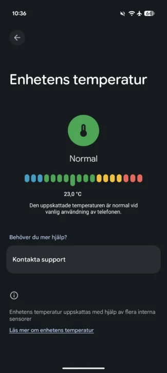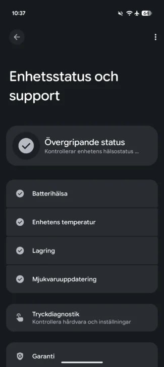 Pixel 6 och senare modeller har fått tillgång till nya kategorin ”Enhetsstatus och support” som visas allra längst ned bland de vanliga inställningarna. Google beskriver kategorin som ett centrum för att förstå telefonens hälsa, med inbyggda tester för att verifiera prestandan. Det går bland annat att se enhetens temperatur.