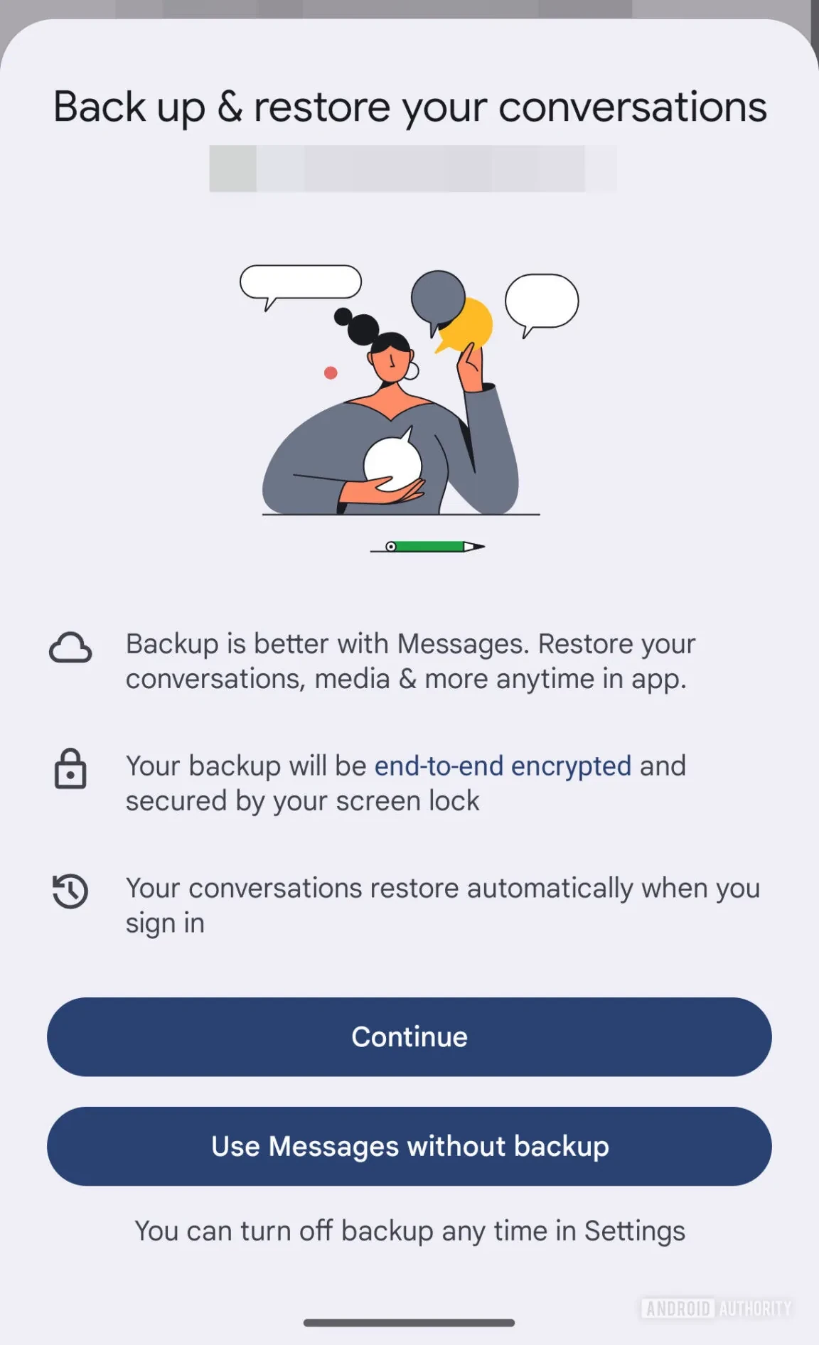Appen sparar både meddelanden och ”bilagor” likt bilder till Google-kontot. Användares säkerhetskopior är end-to-end-krypterade (E2EE). När Messages öppnas på en ny telefon som är inloggad med samma konto återställs alla meddelanden och bilagor. Källan vet inte när backupfunktionen kommer släppas skarpt, men finessen är delvis fungerande i senaste betaversionen av Messages.