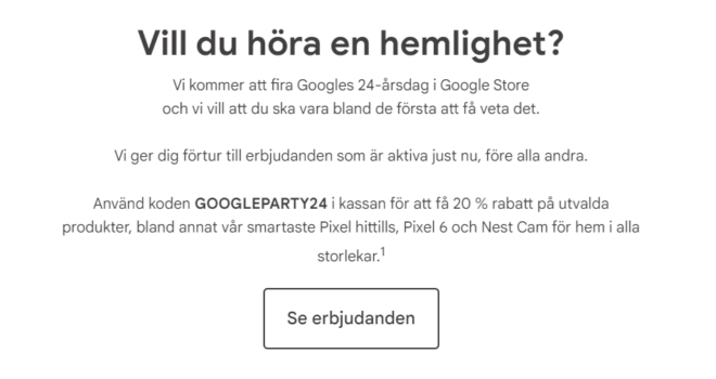 Uppdatering 9/9, kl 12:48: Googles 24-årsjubileum har startat enligt Google Store Sverige och vi kan konstatera att Pixel 6 inte står att finna någonstans på hemsidan. Av denna anledning kan vi bara förmoda att det är tryckfelsnisse som varit framme hos Google och att informationen i utskicket var felaktig.