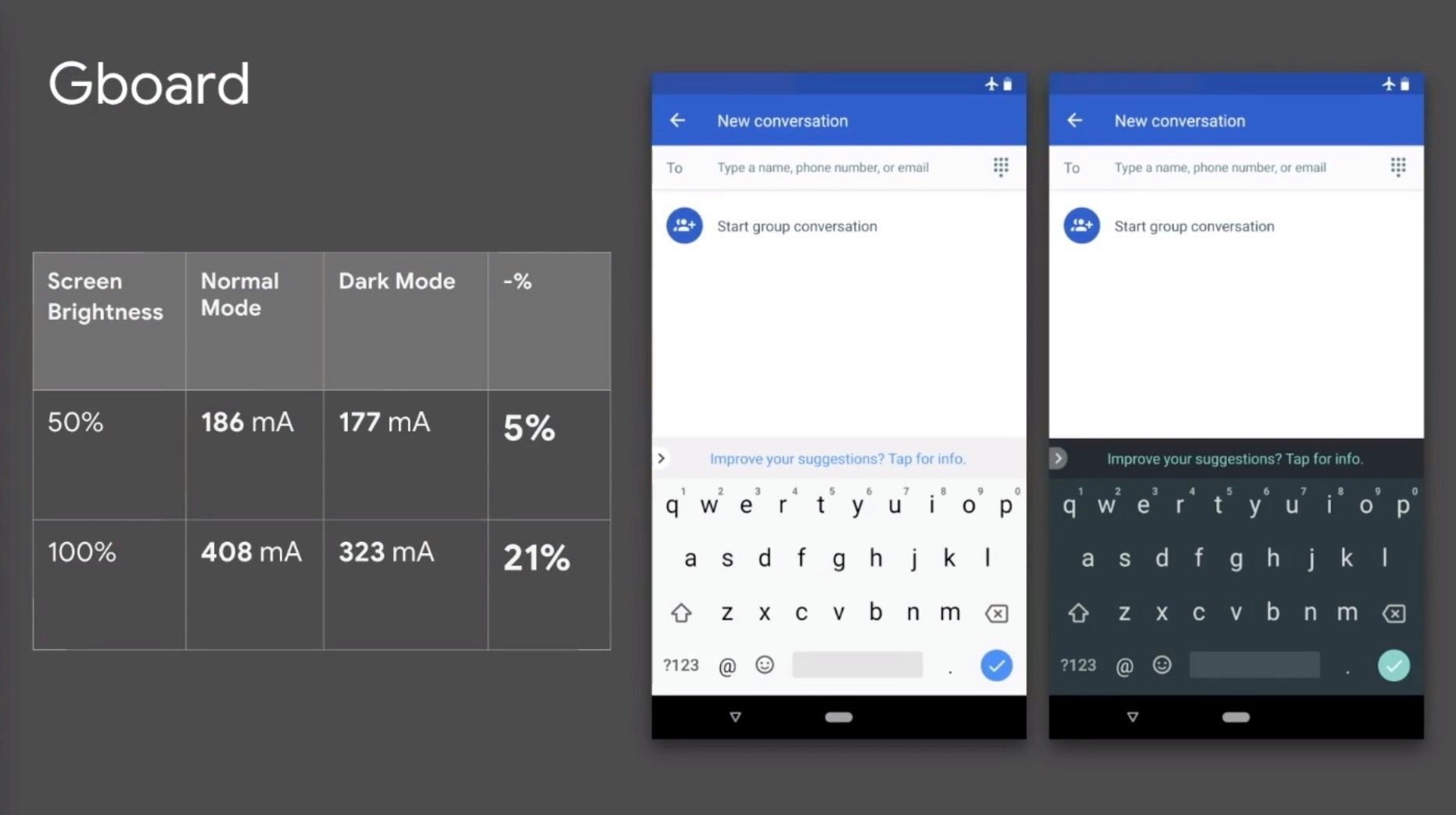 OLED kräver ingen bakbelysning och för helsvarta färger kan pixlarna ”stänga av sig” och nästan inte dra någon ström alls. Google har implementerat mörka teman i sina egna appar senaste tiden – dels för att det är snällare mot ögonen om kvällarna men även för att det sparar ström.
