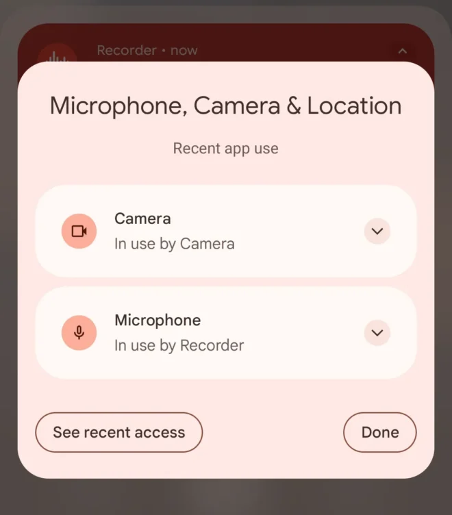 Android visar en ikon i statusfältet för att indikera när appar använder kameran eller mikrofonen, som en integritetsfunktion. I QPR3 visas även en indikator när appar utnyttjar platstjänster och vid tryck går det att se precis vilka appar som kollar din plats.