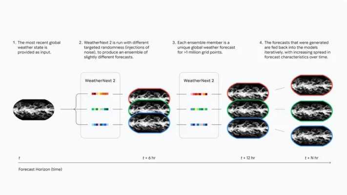Framstegen har skett tack vare artificiell intelligens. Weather Next 2 ska kunna generera prognoser åtta gånger snabbare och upp till en gång i timmen. Modellen är redan tillgänglig och används i praktiken för att förbättra väderprognoser.