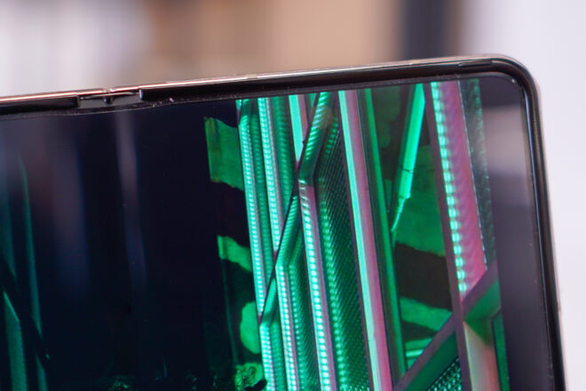Den ofrånkomliga vecket i displayen som går hand i hand med vikbara paneler, i alla fall för närvarande, är i stort sett lika påtagligt som tidigare. Det är mindre uppenbart rakt framifrån medan det blir mer uttalat beroende på betraktningsvinkeln samt omgivningsljus och vad som visas på panelen.