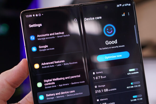 Android 13 är fortfarande inte redo för skarp lansering varför det är givet att telefonen kommer med Android 12. Samsung har valt att använda Android 12L som är en vidareutveckling av Android 12 optimerad för foldables. Föredömligt nog kan vi konstatera att telefonen kör juli månad säkerhetspatch, vilket vi tycker är fullt godkänt då augusti månads patch kom ut för enbart 5 dagar sedan.