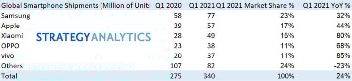 Därefter följer Oppo och Vivo, som båda är del av BBK Electronics tillsammans med OnePlus och Realme. Övriga tillverkare klumpas ihop och har tillsammans 24 % av marknaden, vilket innebär en årlig minskning med 23 %.