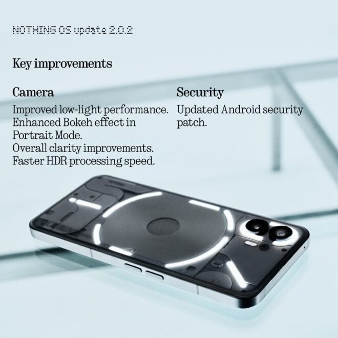 De som skaffat en Nothing Phone 2 ska nu kunna ladda hem en OTA-uppdatering med diverse kameraförbättringar. Nothing nämner specifikt ökad prestanda i dunkel, en förbättrad bokeh-effekt för porträttläget, allmänna förbättringar av skärpan, samt snabbare bearbetning av HDR-bilder.