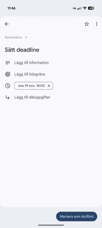 Deadlines är förstås poänglösa för de som anger tidsgränsen från början för uppgifter i Tasks. Funktionen kommer bara till pass när tidpunkten för påminnelsen skiljer sig från när uppgiften måste vara avklarad. I skrivande stund går det bara att ange dag som deadline – ingen tid. Nyheten syns i version 2025.11.03 av Androidappen.
