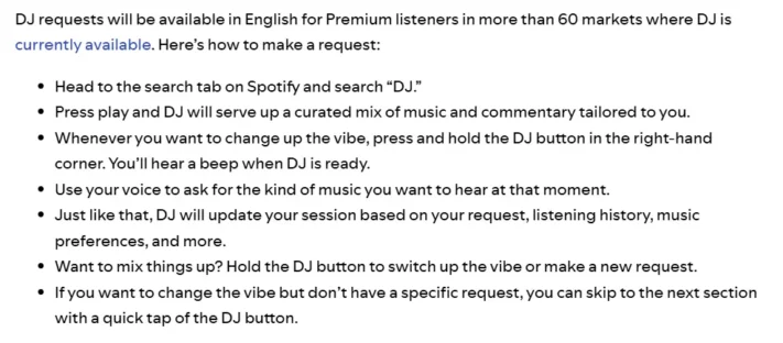Diskjockeyn ska kunna förstå en kombination av genres, humör, artister och aktiviteter. Det går dessutom att be DJ spela specifik musik man aldrig hört förut (eller i alla fall aldrig spelat upp på Spotify tidigare), vilket är mycket praktiskt för att upptäcka nya låtar.