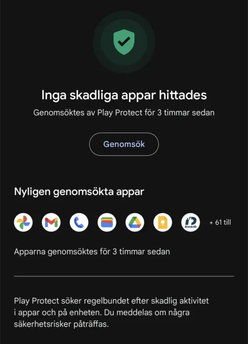 Du kan verifiera att Play Protect är aktivt på din enhet genom att öppna Play Store, trycka på din profilbild uppe i högra hörnet och välja ”Play Protect” i menyn. Google tar säkerheten på största allvar. Pixel har dessutom en valfri inbyggd VPN med krypterad trafik. Numera erbjuder Android därtill ett läge som aktiverar den högsta säkerheten överallt i systemet och i kompatibla appar.