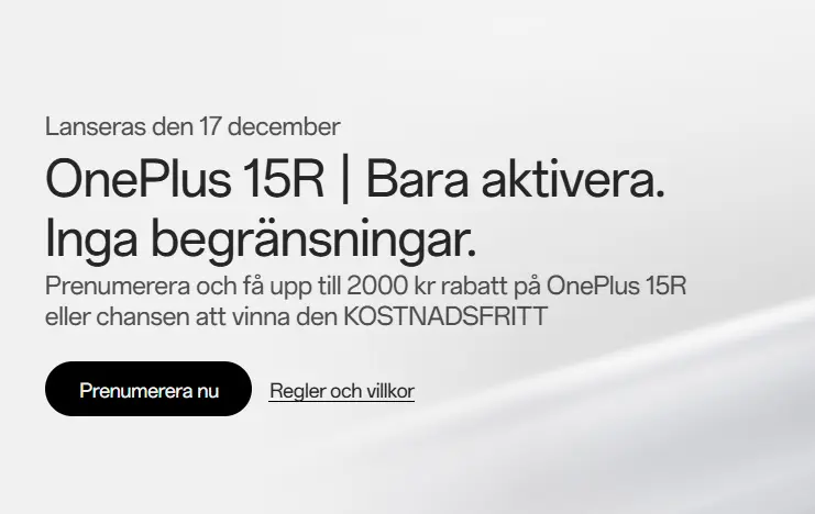 Oneplus har redan bekräftat att nya telefonen 15R kommer släppas i Sverige. Svenska hemsidan puffar för presentationen som sker 17 december. Om tesen att 15R bara är ett nytt namn för Ace 6T kan telefonen erbjuda ett gigantiskt batteri med 8300 mAh.