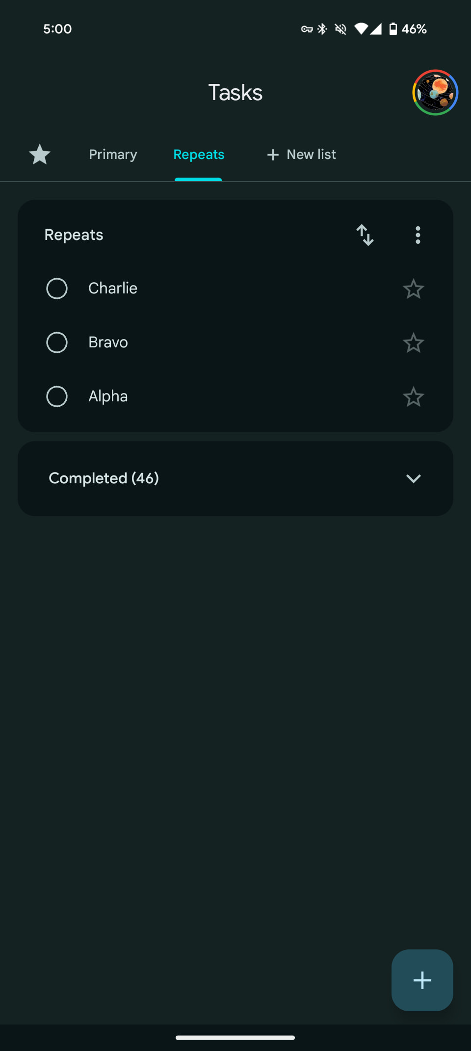 Nu har Google uppdaterat designen för Tasks. Det nedre fältet är borta och kvar är bara plus-knappen – en floating action button (FAB). Påminnelserna listan nu även i avskilda rutor vilket ökar tydligheten.