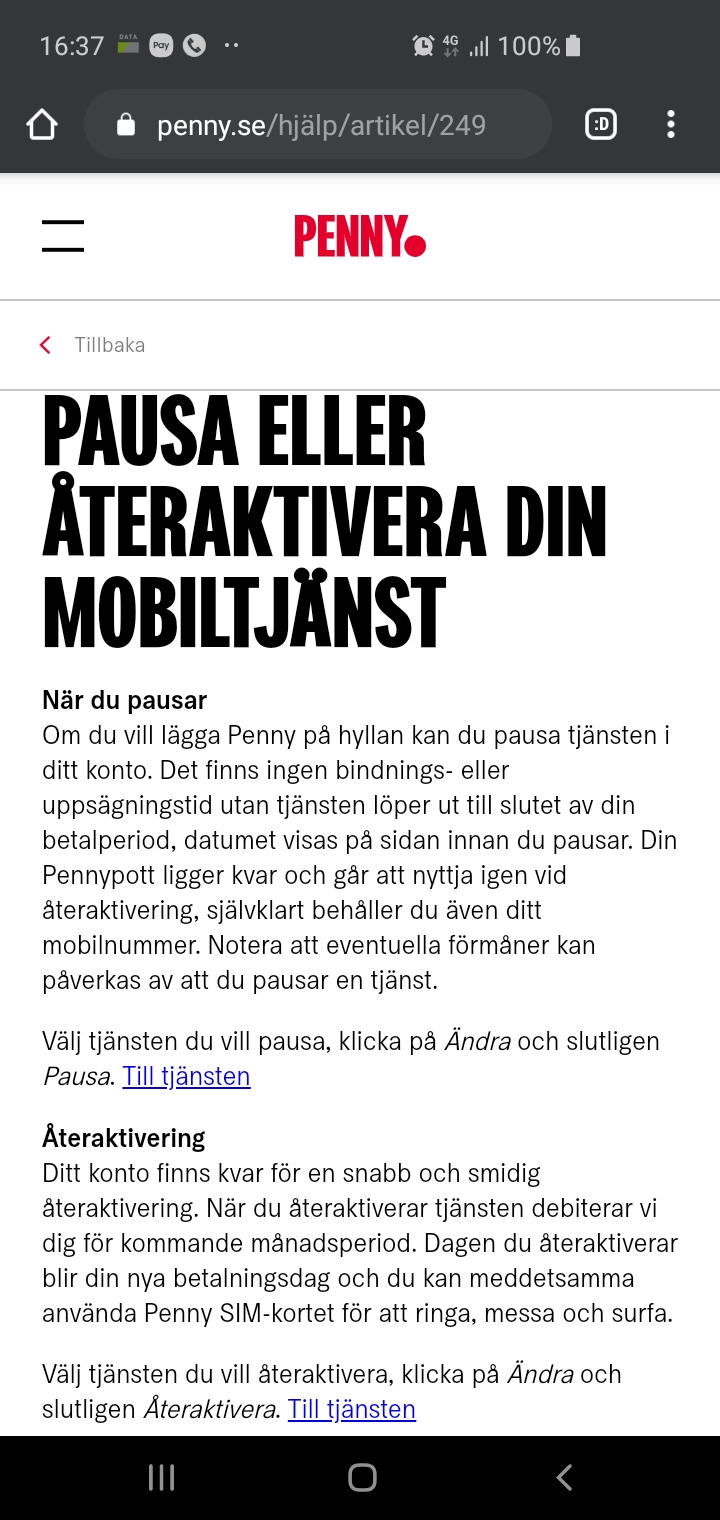 Jämte Vimla (tack för korrigering från uppmärksamma läsare i kommentarerna!) är Penny för närvarande ensamma om att låta abonnemangsinnehavare pausa eller återaktivera abonnemang redan från första dagen, till skillnad från exempelvis Telenor som låter användaren pausa först sex månader efter abonnemangets start. Att man kan pausa vid behov redan från dag ett gör att Penny kan ses som ett bra abonnemang för den som endast behöver ett aktivt telefonabonnemang periodvis, exempelvis i lantstället eller vid resor.