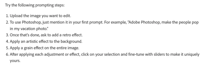 De kompletta programmen har förstås inte integrerats i Chat GPT. Istället går det att rikta sig skriftligt till exempelvis Photoshop eller Acrobat för att utföra de kommandon vi vill. Adobe uppmanar användare att ge specifika, tydliga och beskrivande promptar.
