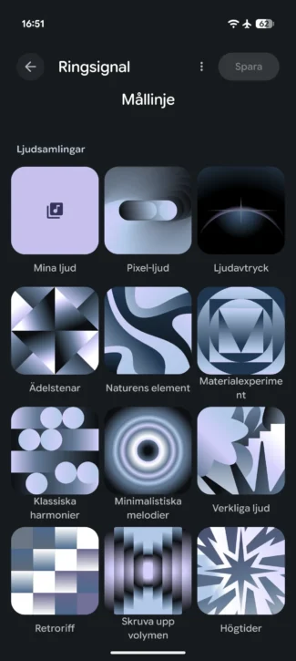 Nu representeras varje ljudkategori av abstrakta bilder. Ljuden nås genom att öppna inställningarna, välja ”Ljud och vibration” och därefter trycka på ”Ringsignal”, ”Avisering” eller ”Standardljud för alarm”.